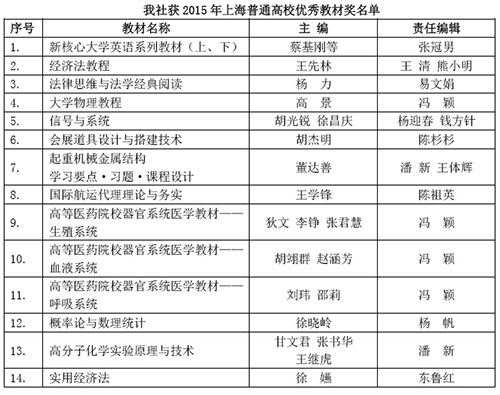 近日,上海市教育委员会下发文件,公布2015年上海普通高校优秀教材奖获奖名单,我社共有14种教材榜上有名。 据悉,该奖项是由上海市教育委员会组织评选,经同行专家推荐、学校遴选、网上公示和专家评审等程序,最终研究确定286本教材获2015年上海普通高校优秀教材奖。 文件指出,各高校要进一步做好教材建设工作,鼓励教师积极编写优秀教材,优先选用优秀教材,发挥优秀教材的示范和辐射作用,提高人才培养质量。