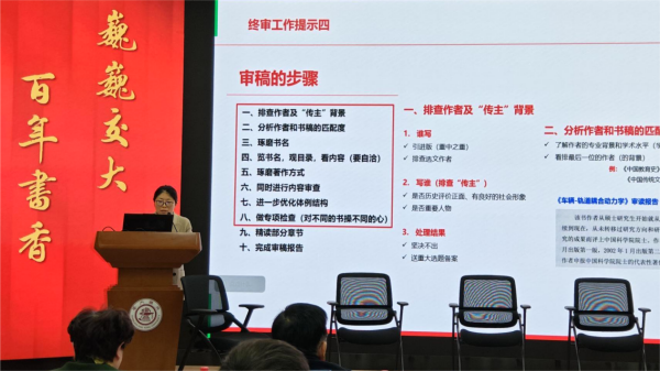 副总编辑武晓雁作终审工作提示,介绍了涉台宣传用语规范文件更新的内容,明确了《部门来稿审核、签发审核及退修、退稿工作要求》《终审工作须知》等文件对审稿不同环节工作的质量要求,详细讲解了作者背景排查、书稿匹配度分析、书名规范性核查等审稿关键步骤,为终审工作提供实操指引。